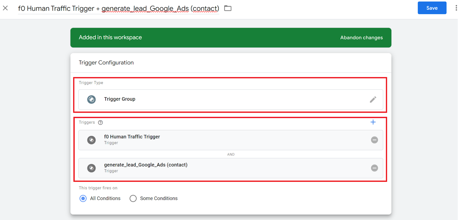 In the trigger configuration, click the little “+”-sign and choose the in section 2.1 created “f0 Human Traffic Filter”. Then click again on the little “+”-sign and select the platform/tool-tag you like to secure (here “generate_lead_Google_Ads (contact)--> in your case this might be a consent + the fraud0 human traffic event). Afterwards give your trigger a name, keep All Conditions.