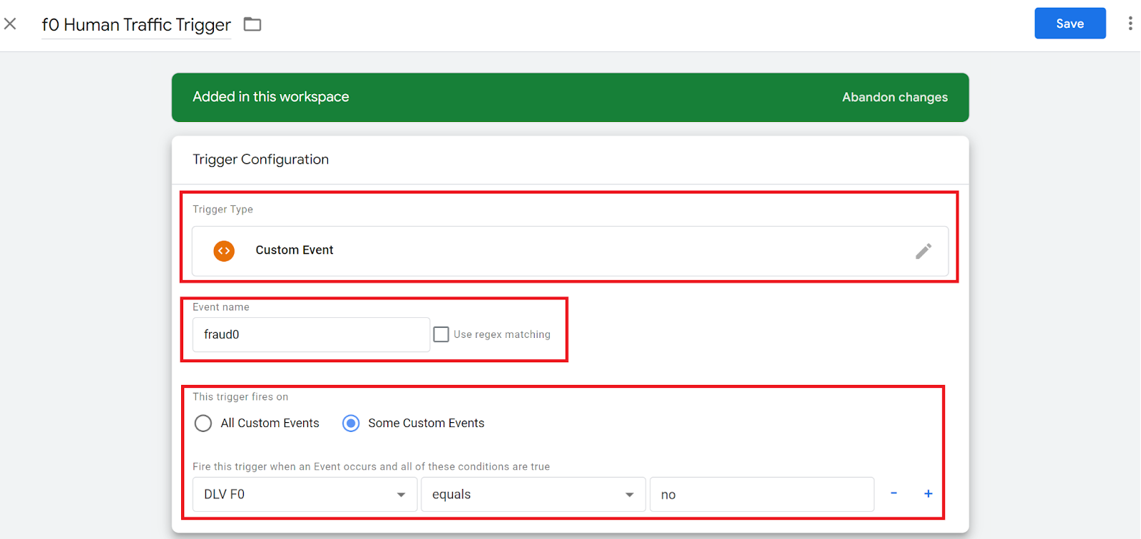 Click on Trigger Configuration and select Custom Event, then give your trigger a name (“f0 Human Traffic Trigger”) and use the Event Name “fraud0”. Please select Some Custom Events, choose the DLV F0 variable, “equals” as operator and “no” as value.